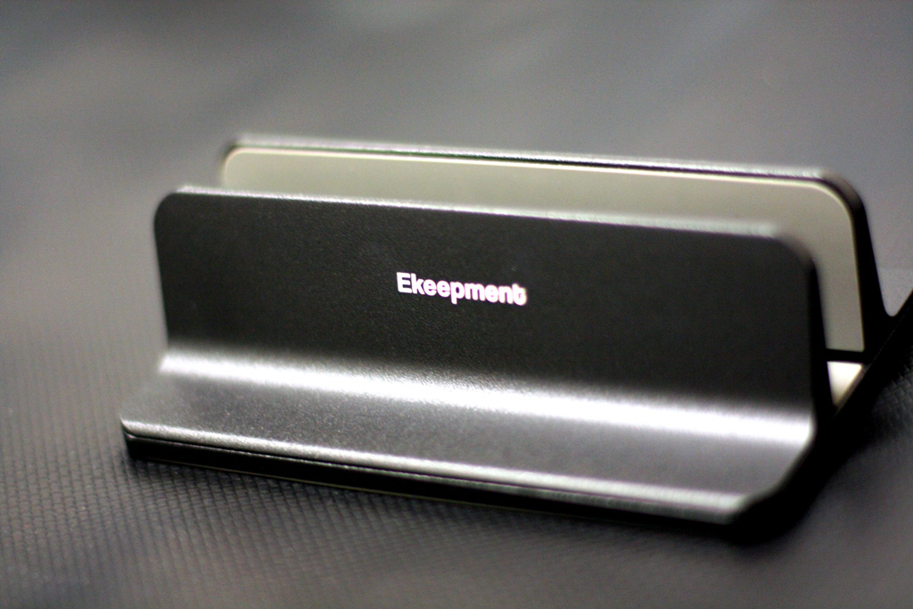 맥북과 맥미니를 세워두고 사용자가 보게 되는 제품의 옆 모습은 Ekppement 의 흰색 컬러의 글자의 제조사 브랜드가 인쇄되어 있습니다