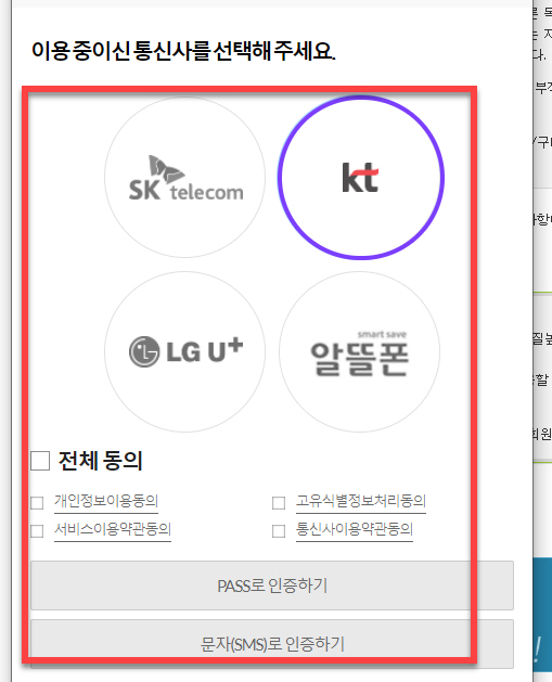 본인 인증은 다른 사이트에서 인증하는 방법과 비슷하게 사용하는 본인 휴대폰의 통신사 로고 이미지를 클릭 한 다음 <전체 동의> 체크박스에 마우스로 선택 후