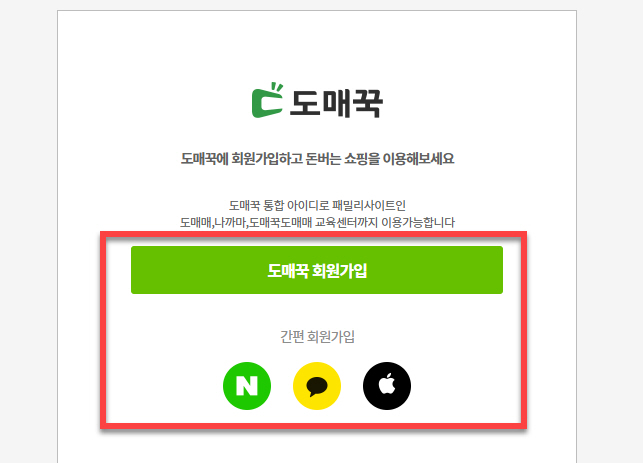 회원가입 과정의 시작 초기 페이지에서 <도매꾹 회원가입> 녹색 버튼을 마우스로 클릭하여 진행할 수 도 있지만, 네이버 아이디, 카카오톡 등의 다른 사이트의 로그인 정보로 <간편회원가입> 으로 간단하게 넘어갈 수 있습니다