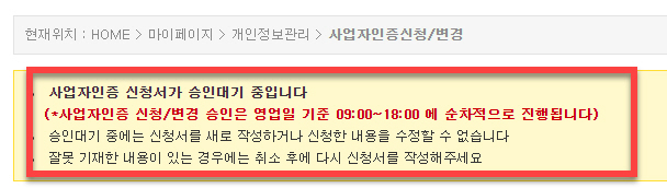 사업자 인증은 접수와 함께 즉시 실시간 승인이 아니기 때문에 조금 여유를 가지고 신청하시는 게 좋을 듯 합니다