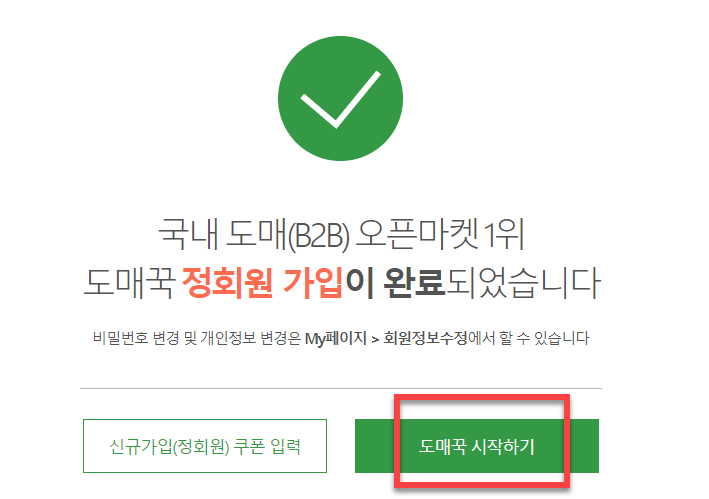 위에서 진행한 과정을 지나오면 크게 어렵지 않게 B2B 도매 오픈마켓인 도매꾹의 정회원 가입을 완료할 수 있습니다