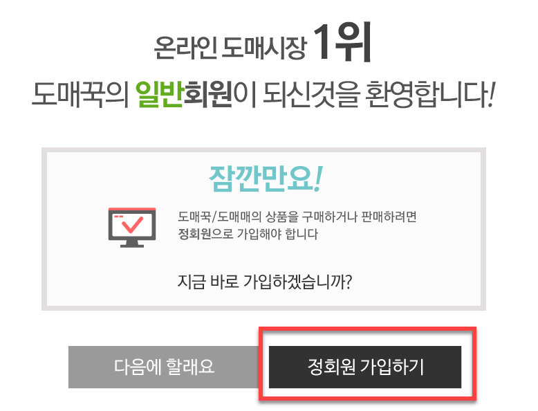 도매꾹, 도매매 온라인 사이트에서 판매되는 상품을 살펴보고 구매&판매하기 위해서는 <정회원> 이라는 회원 단계의 레벨 업(?)이 필요합니다