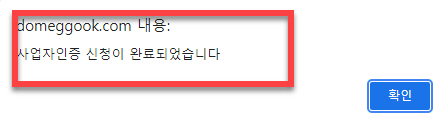 도매꾹 사이트에 사업자인증 신청서를 완료하면 그림과 같이 팝업 윈도우가 표시가 됩니다