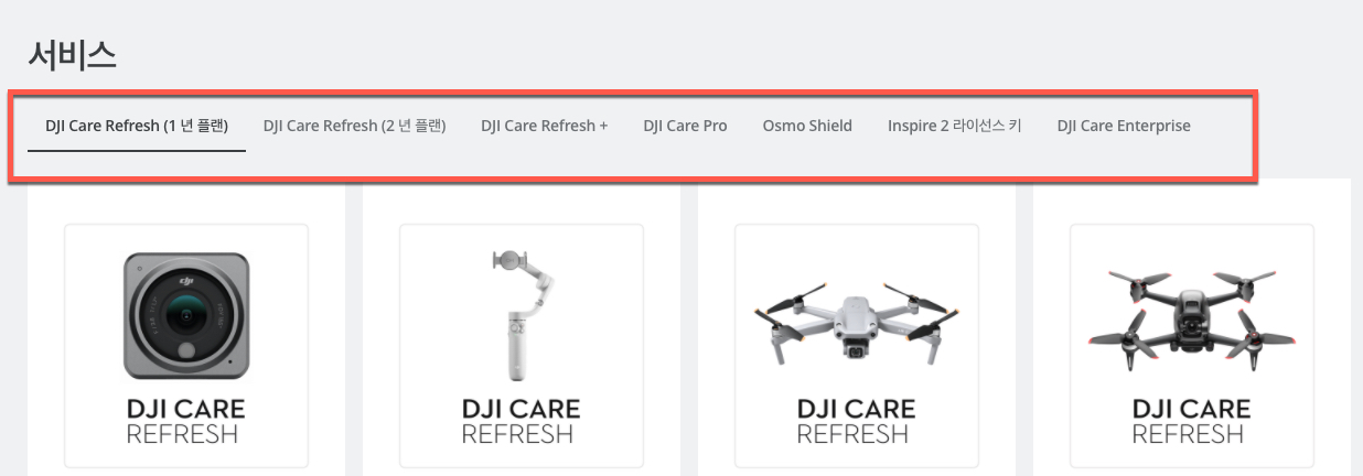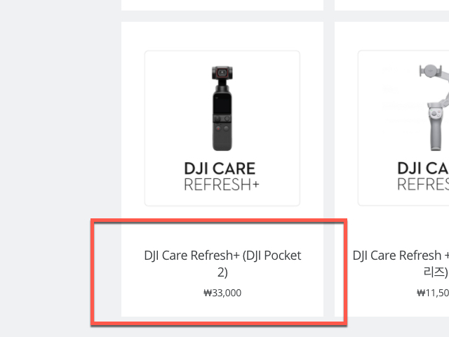 구입한 DJI 포켓2나 액션캠 그리고 드론 등의 제품 케어(Care Refresh) 를 구입할 수 있는 <서비스> 메뉴로 이동을 하면 DJI Care Refresh(1년 플랜), DJI Care Refresh 2년 플랜, DJI Care Refresh+, DJI Care Pro, Osmo Shield, Inspire 2 라이선스 키, DJI Care Enterprise 와 함께 처음 메뉴와 같이 제품 사진과 함께 제공하는 서비스 정보&구매 가격을 바로 확인할 수 있습니다