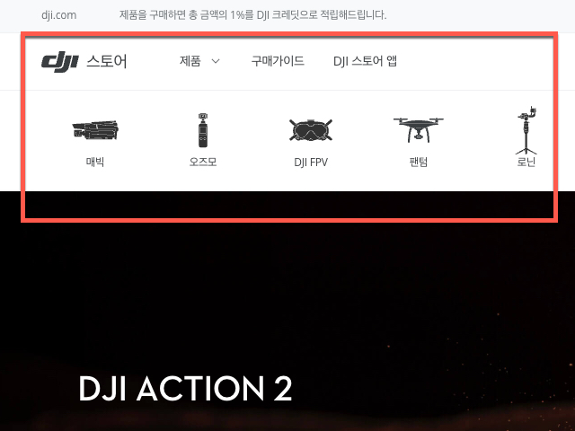 DJI 스토어를 이동하면 구입하려는 제품의 이름과 작은 그림이미지를 같이 메뉴로 표시가 되어 필요한 제품의 메뉴로 이동하는데 도움이 되는 거 같습니다