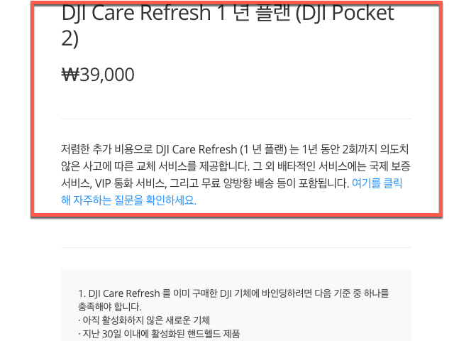 주의사항은 DJI Pocket2 의 DJI Care Refresh 를 구입하기 위해서는 제품구입 후 개봉하여 활성화한 시점으로 30일 이내에서만 구매가 가능합니다