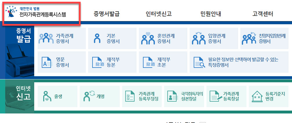 일상에서 일반적으로 전자가족관계등록시스템 사이트에서 방문하는 용도는 <가족관계증명서> 를 발급받기 위해서입니다
