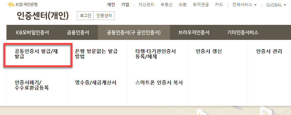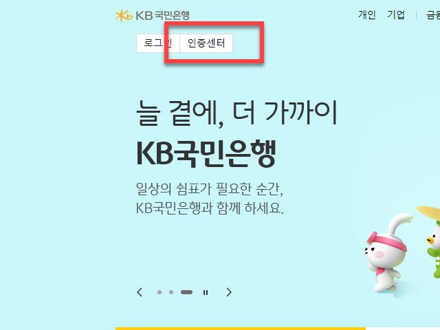 KB국민은행을 이용하신다면 홈페이지 상단에 있는 <인증센터> 링크를 클릭하여 이동하여 작업을 진행하시면 됩니다