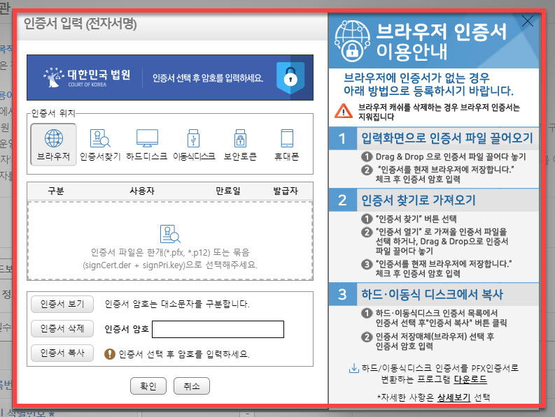 브라우저 인증서 또는 과거 공인인증서로 사용하였던 현재의 공동인증서 중에서 선택하여 사용할 수 있는 점을 알 수 있습니다
