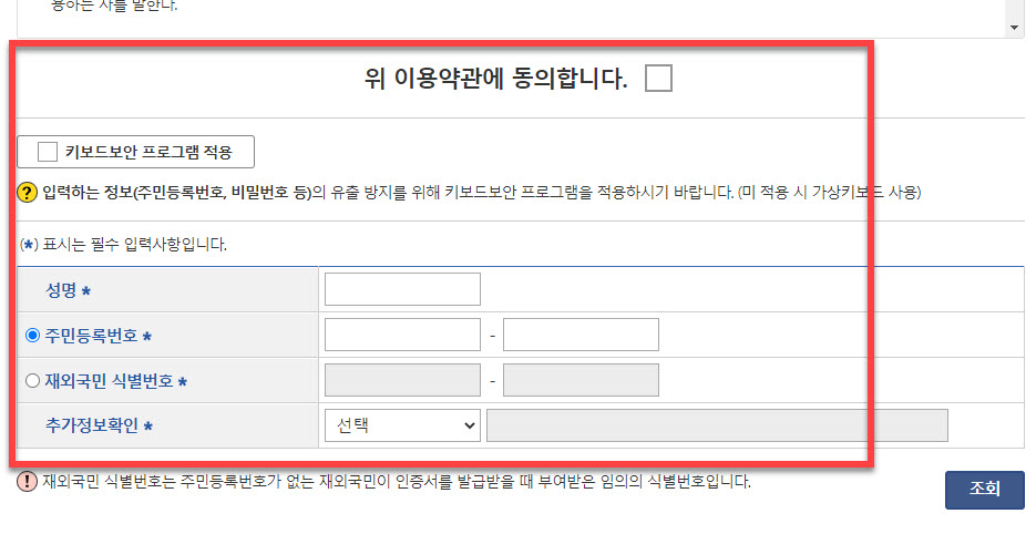 서비스를 이용하기 위해서 클릭 이동을 하면 이용약관에 대한 동의와 함께 필수 입력 사항인 성명, 주민등록번호 그리고 추가 정보 확인에서 부,모,배우자,자녀 의 성명을 입력하여 <조회> 과정을 거치게 됩니다