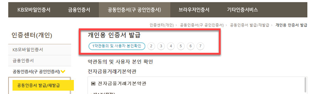 금융인증서로 모든 인증서비스를 대체할 거라고 생각하였던 경우에는 개인용 인증서 발급에 필요한 약관 동의 및 사용자 본인 확인 등의 총 7단계의 과정을 진행해 주셔야 합니다