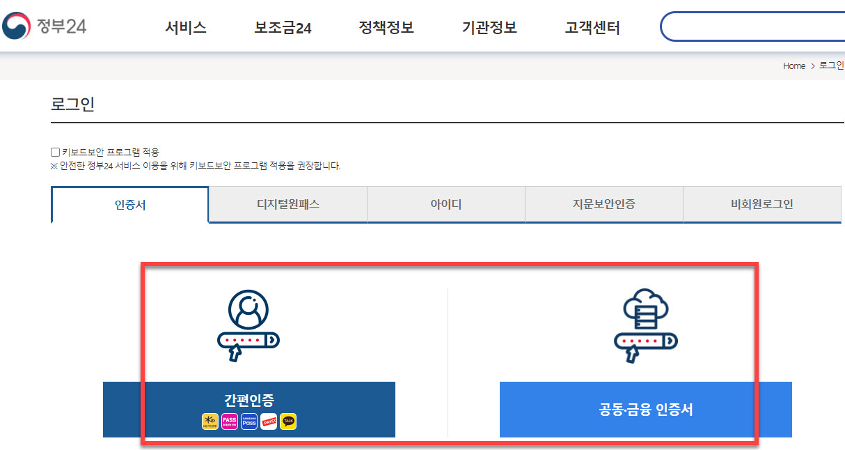 주민등록 등본을 근처 동사무소(주민센터)에 방문하는 시간이나 이동의 번거로움을 줄이며 회사나 가정에 있는 컴퓨터와 프린터로 간편하게 출력할 수 있는 <정부24> 에서는 현재 인증서 로그인 방법으로 페이코, 삼성패스, KB모바일 인증서, 통신사(SKT,KT,LGU+) 의 PASS 휴대폰 인증 그리고 카카오톡 등을 사용하는 간편인증 방법과 공동,금융인증서를 사용할 수 있도록 지원하여 일반인들은 은행 금융 업무 빈도가 높기 때문에 별도의 프로그램을 요구하지 않는 금융인증서로 대체하여 사용하기도 합니다