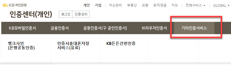 <기타인증 서비스> 의 뱅크사인(은행공동인증), 인증서 휴대폰저장 서비스(유료), KB든든간편인증 를 이용할 수도 있지만 다른 온라인 인증서의 범용성을 생각하시다면 <공동인증서> 를 추가로 발급받는 과정을 진행해 주셔야 합니다