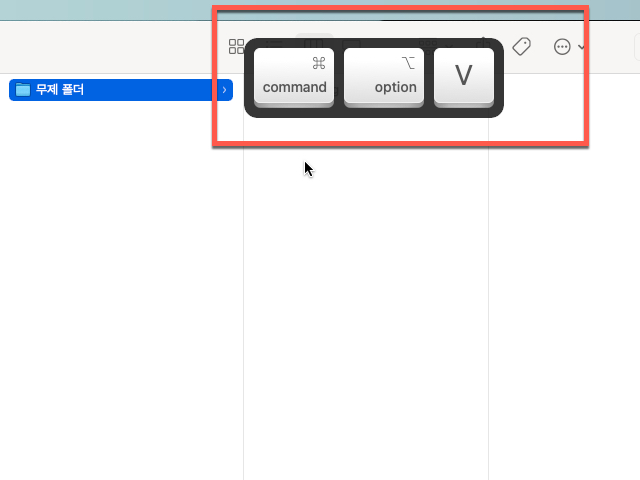 다음으로 파일을 이동하려는 폴더에서 <option(또는 alt) ⌥> 의 맥 컴퓨터에 있는 키와 함께 <command(또는 cmd) ⌘> 키 그리고 <V> 의 3개의 단축키 조합을 사용합니다