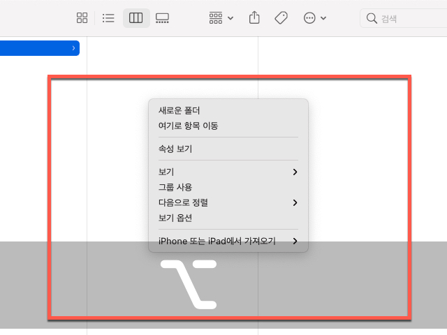 팝업 메뉴가 보이는 상태에서 <option> 키를 누르고 있는 동안에도 동일한 ‘여기로 항목 이동’ 이라는 항목으로 변경되는 모습도 만날 수 있습니다
