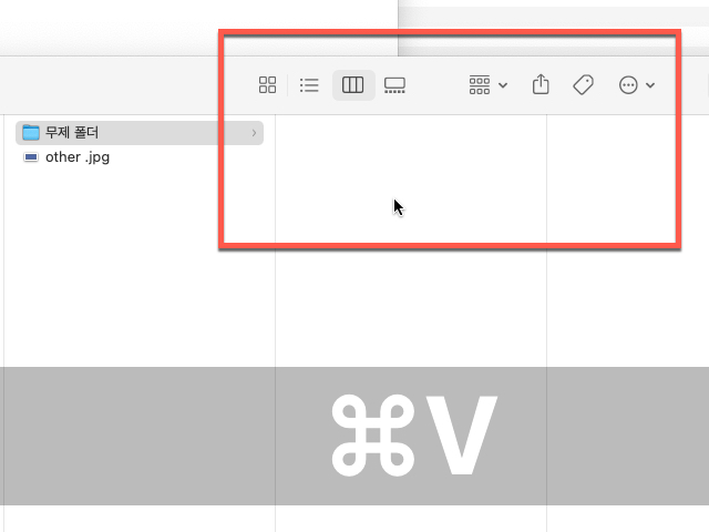 다음으로 파일을 이동하려는 폴더에서 윈도우OS 처럼 <Ctrl+V> 와 같은 <Command + V> 키를 사용하면서 애플 맥 운영체제에서 키보드 위에 있는 인쇄되어 있는 Command(또는 cmd) 키보드 이름과 함께 사용되는 < ⌘ > 를 사용하였지만, 파일을 옳기려는 폴더에는 아무런 반응이 없는 것을 알게 되면서