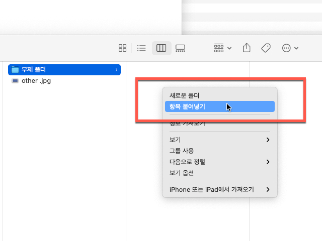 다음으로 해당 기능을 사용하여 이동하려는 폴더에서 다시 한번 팝업 메뉴를 활성화 시키겨서 <항목 붙여넣기>를 선택하면
