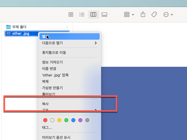 이동하려는 파일을 마우스의 우측 버튼을 클릭하여 보이는 팝업 메뉴에서는 윈도우 OS 팝업창에서 사용하였던 기능인 애플 맥북에서는 <복사> 메뉴를 클릭하시면 됩니다