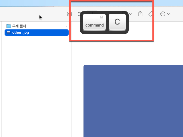 윈도우OS에서 파일을 복사하는 단축키 사용의 시작과 같이 macOS 에서 <command(또는 cmd) ⌘> 키와 함께 파일을 복사하는 단축키 <C> 를 같이 눌러서 사용합니다