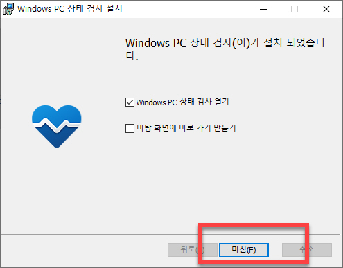 윈도우11 을 현재 컴퓨터PC에 업그레이드 설치가 가능한지 확인을 점검해주는 프로그램 설치가 완료되었다면 <Windows PC 상태 검사 열기> 가 선택되어 있는 기본 설정 상태를 유지하면서 <마침> 버튼을 마우스로 눌러 주시면 됩니다