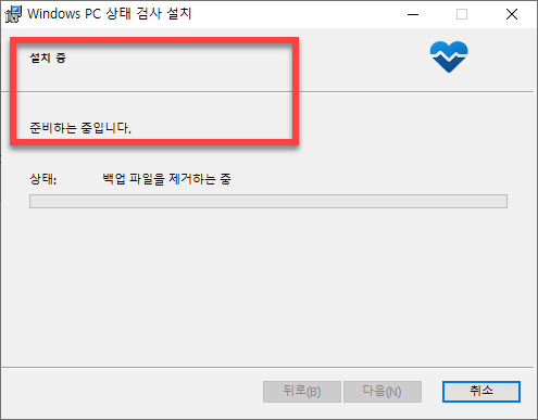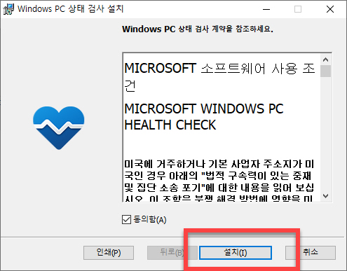 Windows PC 상태 검사 설치 프로그램을 실행하면 가장 먼저 <동의함> 앞에 있는 네모 박스를 마우스로 클릭하여 체크표시를 하셔야 합니다