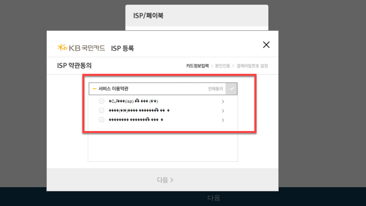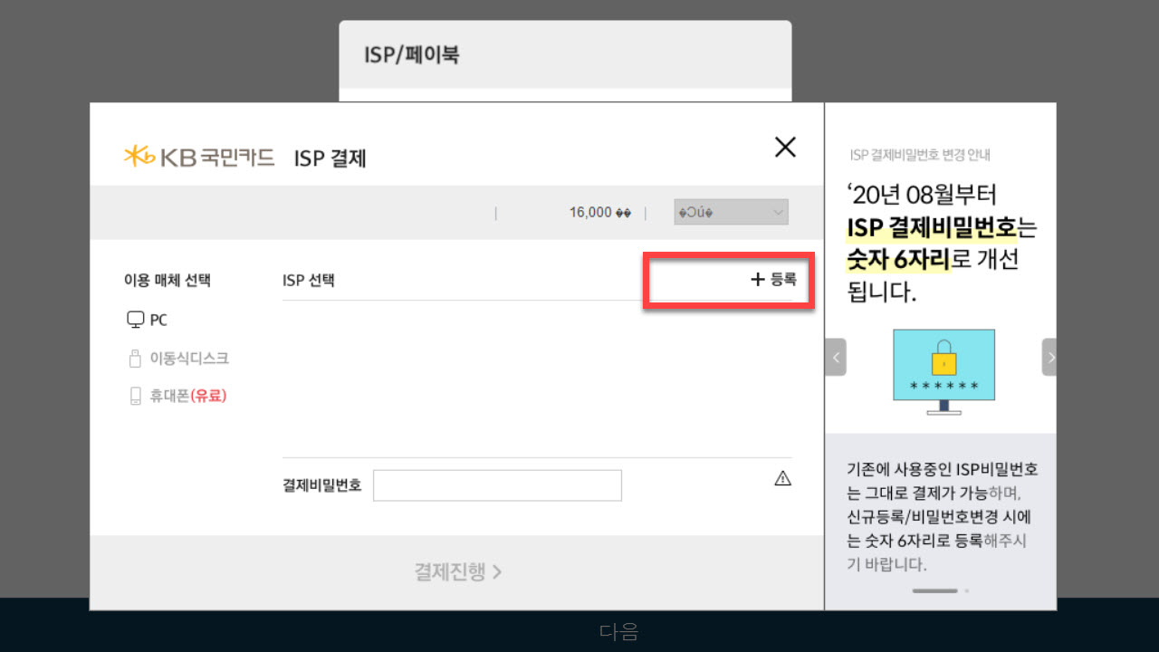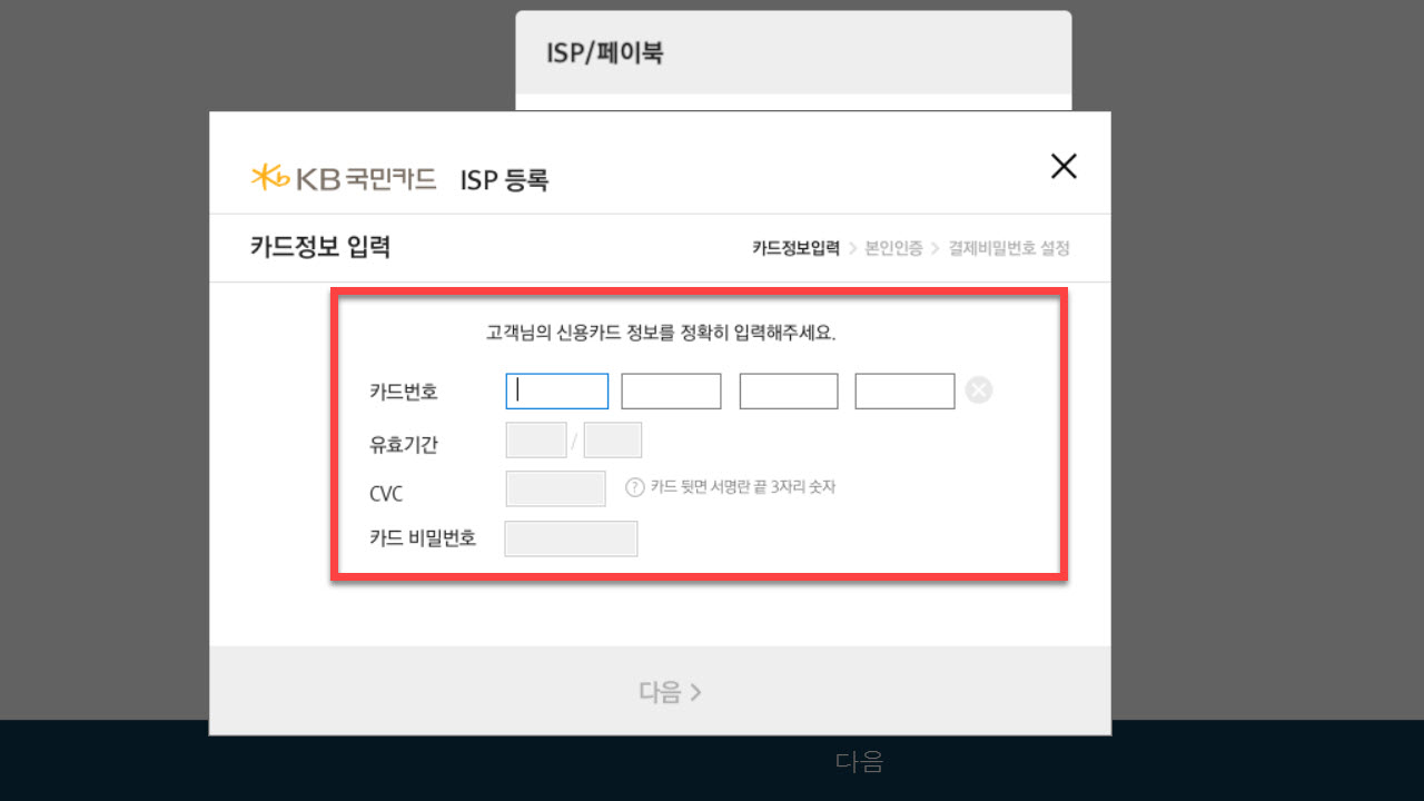 카드번호, 유효년월, 신용카드 뒷면에 있는 3자리 숫자의 CVC 그리고 카드 비밀번호까지 입력하여 ISP 등록을 합니다
