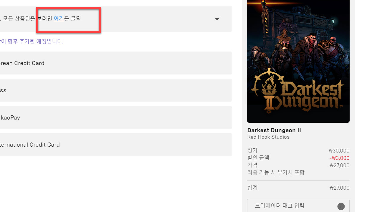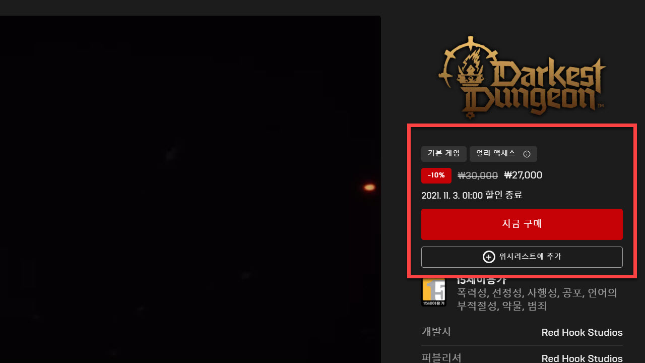 다행스럽게 이번에 구입하려는 Red Hook Studios의 Darkest Dungeon 2 신작을 정가 3만원에서 10% 할인된 27,000원에 구입할 수 있도록 세일을 하고 있습니다