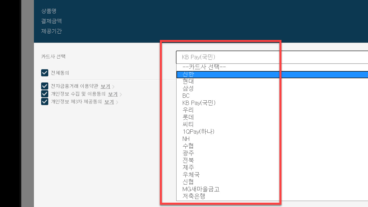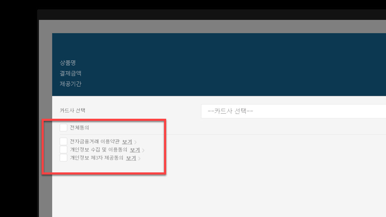 결제 과정에서는 항상 필요한 약관 동의에 체크 표시를 해줘야 하는 단계입니다