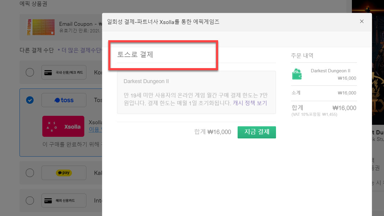 토스 & 카카오톡 으로 EPIC 게임 구매 결제 지원