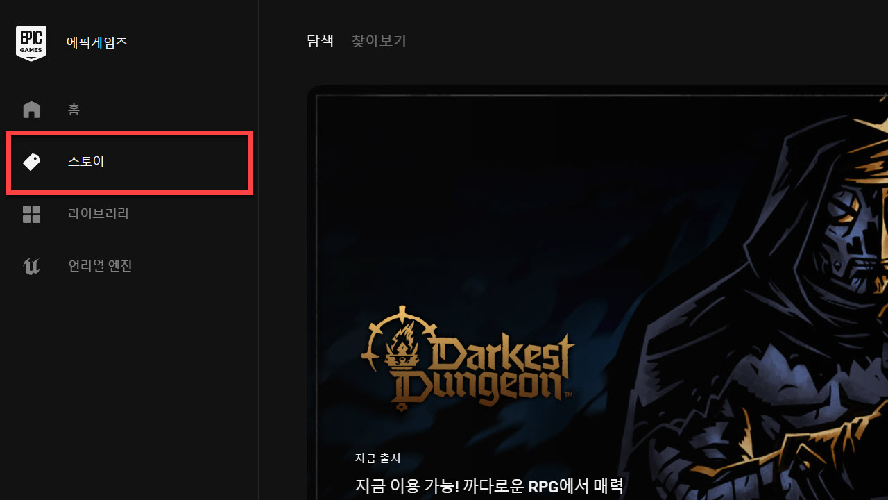 컴퓨터에 설치된 에픽게임즈 전용 브라우저를 실행하면 좌측에 있는 메뉴 목록 중에서 <스토어> 항목을 마우스로 클릭하여 이동을 합니다