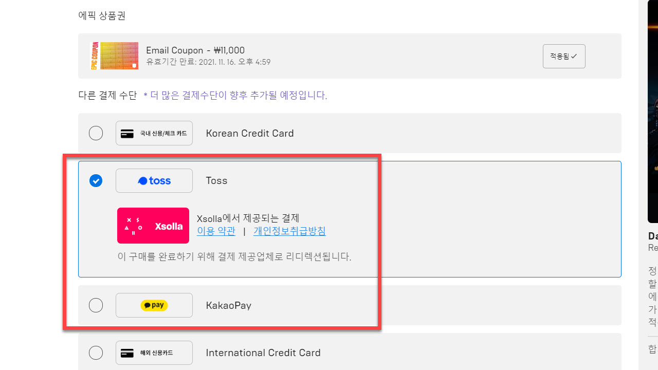 이번 시간에는 Epic games에서 구입하고 싶었던 게임에 쿠폰이 있을 때 사용하는 방법과 결제방법으로 일반적으로 신용카드와 함께 사용되는 다른 지불수단(토스(Toss)) 들도 살펴보려고 합니다