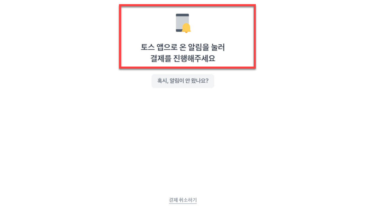 다음 화면에서는 스마트폰에서 사용하고 있는 토스 앱에서 표시된 알림을 확인하여 결제를 진행해주시면 신용카드나 체크카드보다 간편하게 결제할 수 있는 장점이 있습니다
