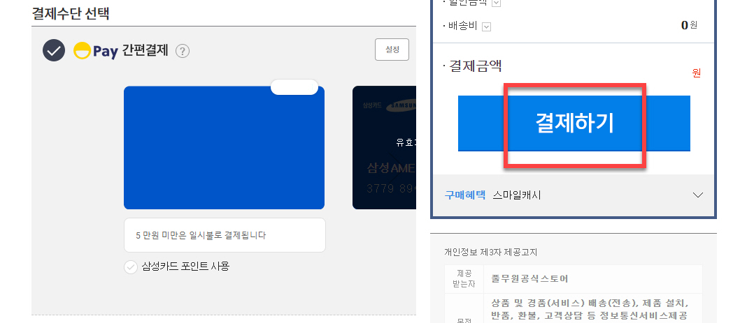 조금 전 장바구니에 담아서 결제 카드를 등록&변경 작업으로 잠시 대기하였던 작업을 완료할 수 있도록 선택한 신용카드를 확인 후 <결제하기> 를 클릭해주시면 작업이 완료됩니다
