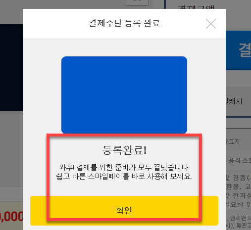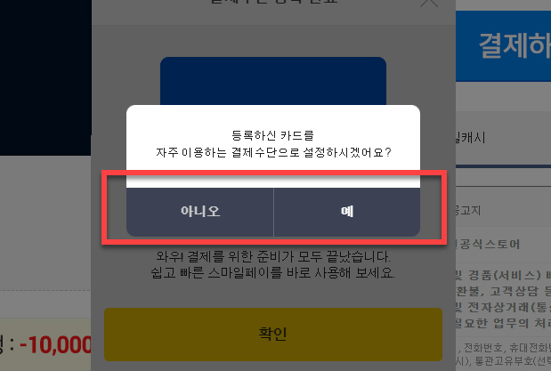 지금 등록한 등록 결제 수단을 <자주 이용하는 결제수단> 으로 설정을 물어보는 단계로 자주 사용하는 결제 카드로 등록이 필요한 분들은 <예> 를, 이번 구매 결제를 할 때만 카드사 할인에 적용하여 추가 할인에 사용하려는 분들은 <아니오> 를 선택하시면 됩니다