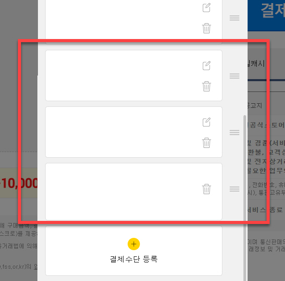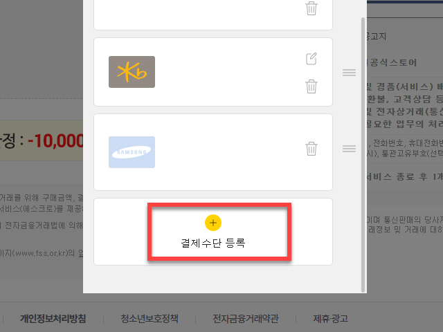 기존에 등록한 신용카드나 체크카드의 유효기간이 만료하여 새로 등록하여 관리하고 싶거나, 다른 신용카드를 등록하기 위해서는 팝업창 아래 부분에 있는 <결제 수단 등록> 영역을 마우스로 클릭합니다