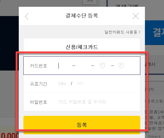 일반적으로 많은 분들이 이용하고 있는 결제 수단 중에 하나인 <신용카드> 로 간편결제를 등록하는 경우에는 카드번호, 유효기간 그리고 사용하고 있는 카드 비밀번호를 같이 입력 후 <등록> 버튼을 눌러주시면 다음 단계로 이동할 수 있습니다