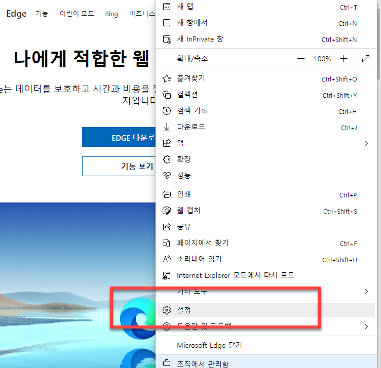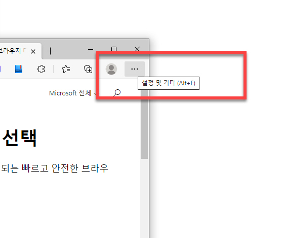 실행된 마이크로소프트 엣지 웹브라우저 윈도우창 우측 상단에 있는 < … > 의 <설정 및 기타> 메뉴로 마우스를 이동합니다