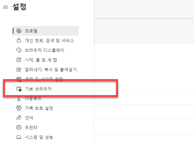 다음으로 다양한 설정 옵션 중에서 <기본 브라우저> 항목을 찾아서 선택합니다