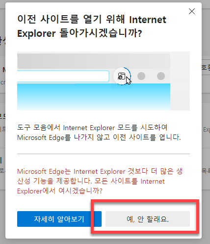 마지막으로 <이전 사이트를 열기 위해 Internet Explorer 돌아가시겠습니까?> 라는 팝업창 아래 부분 선택 버튼 중에서 <예, 안 할래요> 을 선택 클릭해주시면 다음부터는 컴퓨터 바탕화면에 있는 인터넷 익스플로러를 클릭 실행하면 엣지 브라우저가 아닌 인터넷 익스플로러가 실행되면서 웹사이트 페이지 로그인이나 사이트에서 제공하는 기능을 사용할 수 있는 사이트를 사용할 수 있습니다