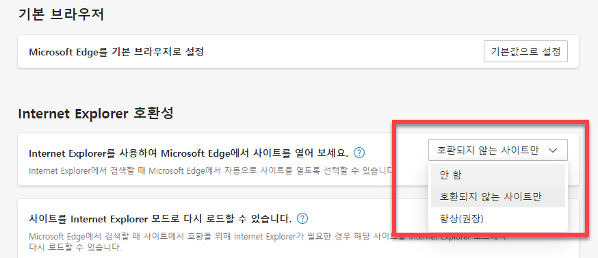 기본 브라우저 설정 페이지에서 <Internet Explorer 호환성> 영역 아래에 있는 설정 중에서 <Internet Explorer를 사용하여 Microsoft Edge에서 사이트를 열어 보세요> 항목 우측에 있는 목록 중에서 <안함> 으로 선택을 해주시면 됩니다