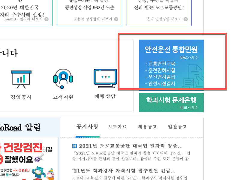 다음(daum), 구글(google), 네이버(naver)의 검색엔진에서도 도로교통공단 홈페이지 이름을 검색 창에서 조회하여 표시되는 공식 사이트 링크를 클릭하면 그림과 같은 페이지를 만날 수 있습니다
