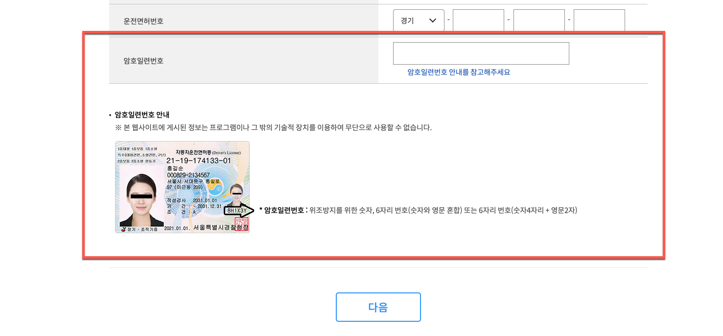 은행 금융 비대면 본인인증 본인 진위확인을 위한 정보, 운전면허증 암호일련번호