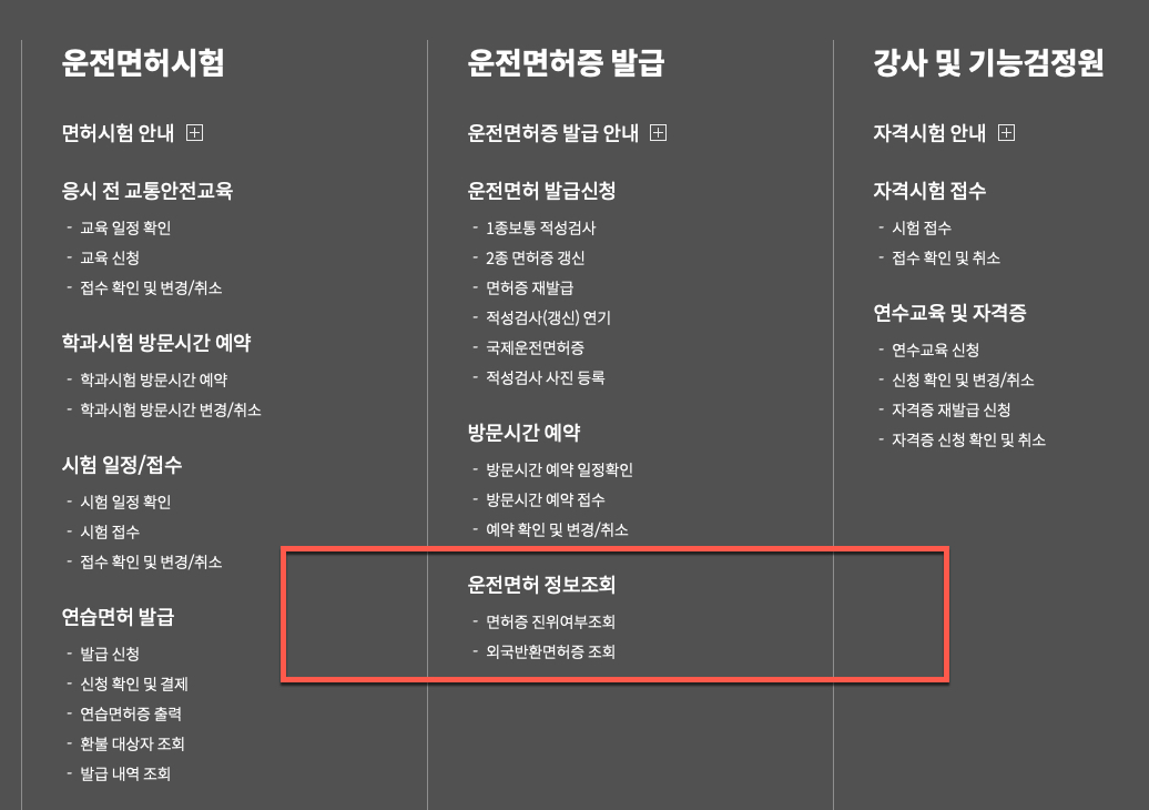펼쳐진 전체 메뉴 중에서 <운전면허증 발급> 대 메뉴 아래에 있는 <면허증 진위여부 조회> 텍스트 링크를 찾았다면 마우스로 클릭하시면 됩니다