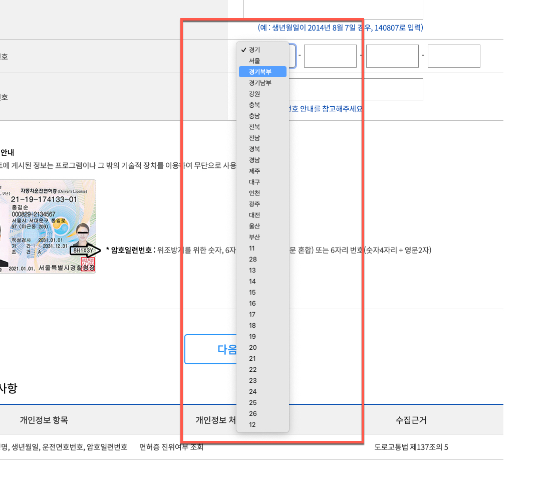 운전면허번호의 가장 앞자리는 지역 과 숫자 중에서 선택하여 입력할 수 있습니다