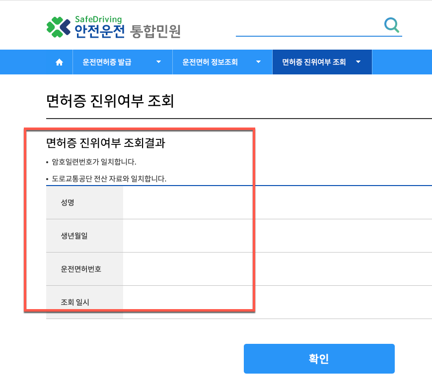 정확한 정보를 입력하셨다면 면허증 진위여부 조회를 위해 사용한 성명, 생년월일, 운전면허번호와 조회 일시 정보를 다시 보여주면서 <암호 일련번호가 일치합니다> 라는 결과를 텍스트 틈 사이에서 볼 수 있습니다