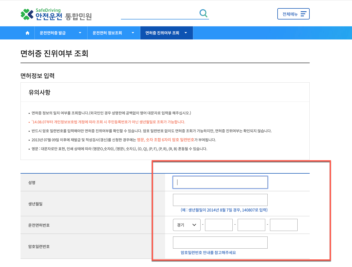 운전면허증 진위여부 확인 용도로 사용하는 <일렬번호> 와 자동차면허증 번호를 조회하여 진위여부로 조회할 수 있는 도로교통공단 홈페이지에서 알아가는 모습을 보려고 합니다