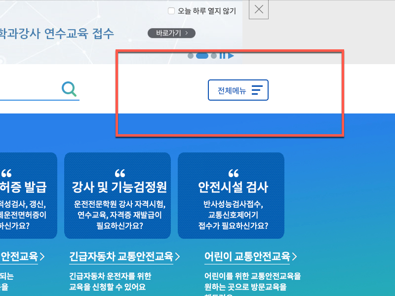 이동한 <안전운전 통합민원>페이지에서는 <전체메뉴> 를 클릭하여 사이트의 모든 메뉴를 보는 방법을 이용하는 게 좋습니다