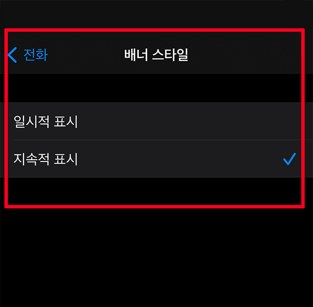 아래에 있는 <배너 스타일> 을 선택하면 세부 옵션에서는 배너 알림을 <일시적 표시> 와 <지속적 표시> 의 2가지 선택 중에 고를 수 있습니다