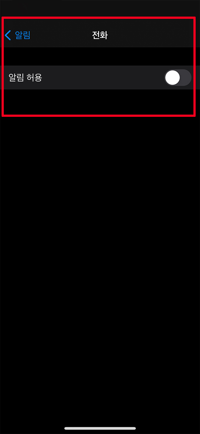 만약 알림 표시가 전혀 표시되지 않도록 하려는 분들은 <알림> 설정 상단에 있었던 <알림 허용> 을 터치하여 비활성화하면 아래 부분에 있던 선택 가능한 옵션 설정이 모두 표시가 사라지는 모습을 볼 수 있습니다