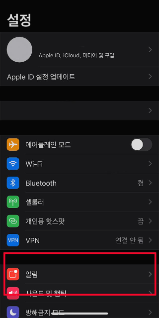 와이파이나 블루투스 연결 설정을 위해서 확인하는 용도로 자주 이용하였던 설정 앱 처음화면에서 조금 아래에 있는 <알림> 설정 항목을 쉽게 찾을 수 있습니다